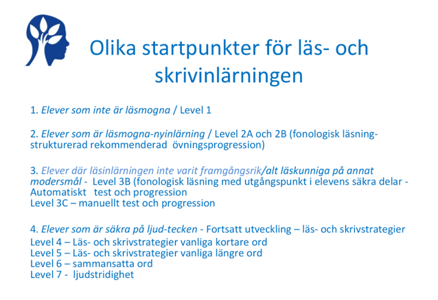 - Level 4 -7: Utvecklar goda och snabba avkodningsstrategier genom en tydlig progression och ett genomtänkt införande av strategier. Många elever med specifika läs- och skrivsvårigheter har ett begränsat arbetsminne och för dessa elever är det extra viktigt att få undervisning i hållbara avkodningsstrategier; hur man kan sikta på vokalen samt dela upp orden i delar.